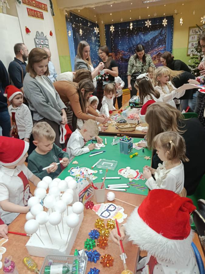 Dzieci wspólnie z rodzicami wykonały piękne i różnorodne ozdoby choinkowe.
